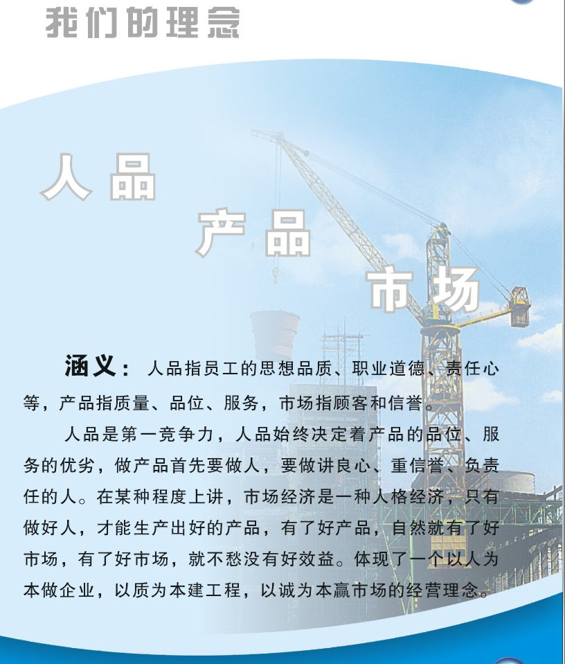 人品是第一競爭力,人品始終決定著產(chǎn)品的品位,服務(wù)的優(yōu)劣,做產(chǎn)品首先要做人,要做講良心、重信譽(yù)、負(fù)責(zé)任的人,在某種程度上講,市場經(jīng)濟(jì)是一種人格經(jīng)濟(jì),只有做好人,才能生產(chǎn)出好的產(chǎn)品,有了好產(chǎn)品,自然就有了好市場,有了好市場,就不愁沒有好效益。體現(xiàn)了一個以人為本做企業(yè),以質(zhì)為本建工程,以誠為本贏市場的經(jīng)營理念。