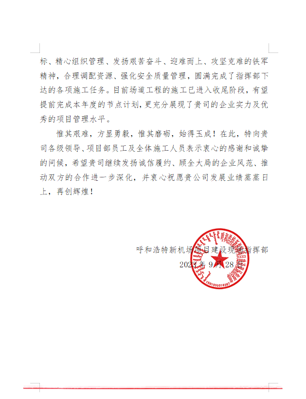 2023年9月28日,呼和浩特新機場項目建設(shè)現(xiàn)場指揮部給我司發(fā)來表揚信,信中充分肯定了我司在呼和浩特新機場項目建設(shè)中項目部全體員工統(tǒng)一思想錨定目標(biāo)、精心組織管理、發(fā)揚艱苦奮斗、迎難而上、攻堅克難的鐵軍精神,合理調(diào)配資源、強化安全質(zhì)量管理,圓滿完成了指揮部下達的各項施工任務(wù)。