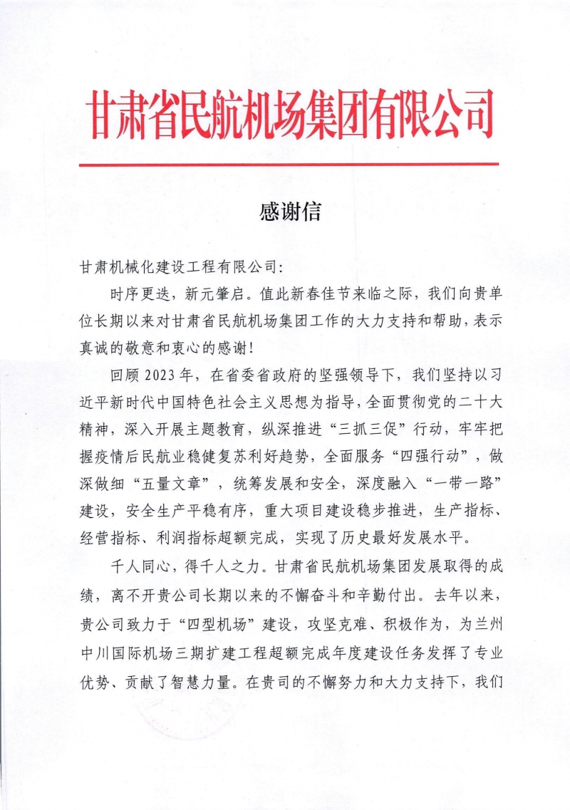 2月8日,新春佳節(jié)來臨之際,我司收到來自甘肅省民航機(jī)場集團(tuán)有限公司的感謝信。