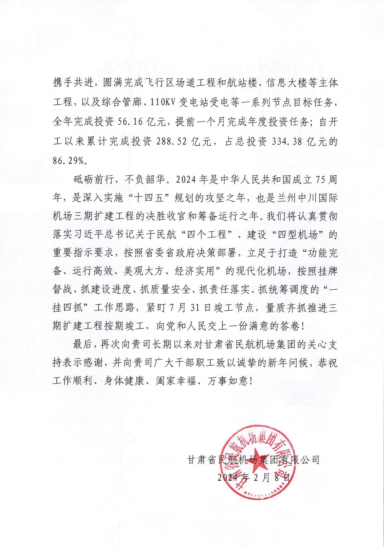 最后,甘肅省民航機(jī)場集團(tuán)有限公司再次向我司長期以來對(duì)甘肅省民航機(jī)場集團(tuán)的關(guān)心支持表示感謝,并向我司廣大干部職工致以誠摯的新年問候!