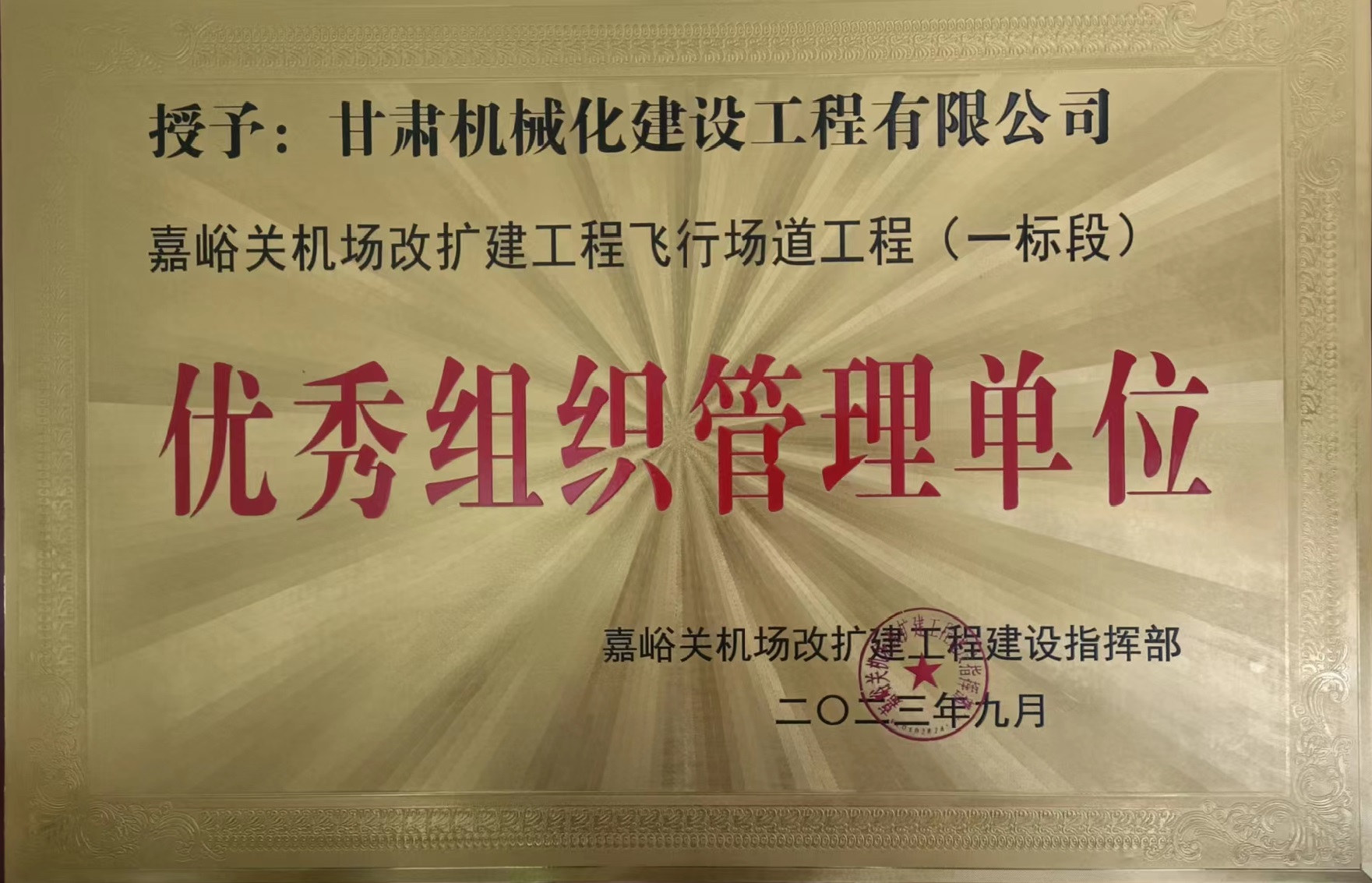 嘉峪關(guān)機(jī)場(chǎng)改擴(kuò)建工程飛行場(chǎng)道工程 (一標(biāo)段)優(yōu)秀組織管理單位